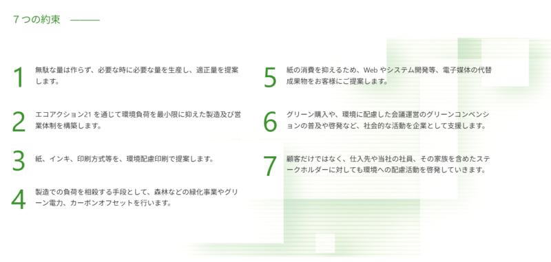 印刷業とは大量に紙資源を消費する製造業です。私たちに課せられた使命は、地球環境の負荷を最小限に 抑えながら、文化を広く伝承するお手伝いを行い、サステナブルな製造体制を構築し社会に貢献することに あります。では、環境負荷を低減し、どう製造業としての役割を果たすのでしょうか?私たちは7 つの約束 を守り、サステナブルな企業作りを目指します。